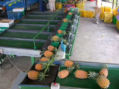 鳳梨冠芽長且帶刺,果實外表鱗片粗糙,以人工切削方法不但辛苦耗時,熟練者1分鐘約削1粒,時間雖不長,但危險性高亦不衛生。本機作業流程採用人工單粒化置料、挾持定位、去冠芽及頭端、削皮兼抽硬果心至出料為連續一貫作業化,作業量240粒/小時,去皮淨度95%以上,可大幅提昇作業效率,降低生產成本,消費者也可即時享用新鮮且衛生之機削鳳梨。